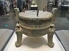 In the 1930s his tomb at Shou County, Anhui Province was destroyed by warlords, and many artifacts were dispersed, but a great bronze cauldron or ding called 楚大鼎 was preserved and is on display in Anhui Museum.[2]