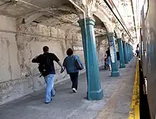 This open-cut station has four tracks and two side platforms. The two center express tracks are not normally used, but both tracks are available for rerouted trains. The platforms are carved within the Earth's crust on an open cut. The concrete walls and columns are painted beige (previously the columns were blue-green).