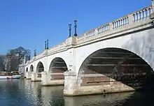 Following a lengthy campaign which came to a conclusion in 1869, the bridge became free from tolls on 12 March 1870,[8] and celebrations including a fireworks show were followed a few days later with the burning of the toll gates on Hampton Green. In March 1906, London United Tramways installed tramlines on Kingston Bridge, connecting the Surrey and Middlesex routes.[11] The increase in traffic and the narrowness of the road became a problem and in 1911 the engineering firm Mott & Hay was contracted to widen the bridge on the downstream side.[12] The work was undertaken between 1912 and 1914 with the carriageway increased from 25 feet (7.6 m) to 55 feet (17 m). A new façade of Portland stone was designed to replicate the features of the original. The bridge was reopened in October 1914.[8] In 1931, the trams were replaced by trolleybuses - before these were replaced by diesel buses in 1962.[13] Following construction of the Kingston Relief Road in the late 1980s, the bridge was widened again in 2000 to include two cycle lanes, larger pavements and a bus lane, from 55 feet (17 m) to 79 feet (24 m).