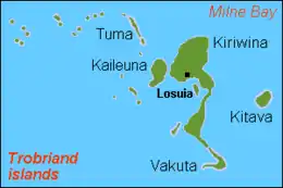 Kiriwina is the largest of the Trobriand Islands, with an area of 290.5 km².[1] It is part of the Milne Bay Province of Papua New Guinea. Most of the 12,000 people who live in the Trobriands live on Kiriwina. The Kilivila language, also known as Kiriwina, is spoken on the island. The main town is Losuia. The island falls under the administrative division of Kiriwina Rural LLG.