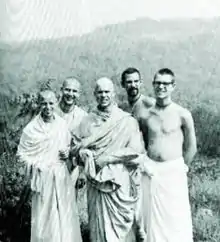 Kīrtanānanda was among the first of Swāmiji's western disciples to shave his head (apart from the sikha), don robes (traditional Bengali Vaishnava clothing consists of dhoti and kurta), and move into the temple. In March 1967, on the order of Swāmiji, Kīrtanānanda and Janus Dambergs (Janardana Dāsa), a French-speaking university student, established the Montreal Hare Krishna temple. On August 28, 1967, while traveling with Swāmiji in India, Kīrtanānanda Dāsa became Prabhupāda's first disciple to be initiated into the Vaishnava order of renunciation (sannyasa: a lifelong vow of celibacy in mind, word, and body), and received the name Kīrtanānanda Swāmi. Within weeks, however, he returned to New York City against Prabhupāda's wishes and attempted to add esoteric cultural elements of Christianity to Prabhupāda's devotional bhakti system. Other disciples of Prabhupāda saw this as a takeover attempt. In letters from India, Prabhupāda soundly chastised him and banned him from preaching in ISKCON temples.[6][7]