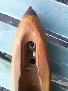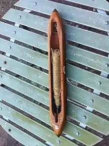 Shuttles were constructed from a dense heavy hardwood with metal tips. The wood was traditionally sourced from a box tree. Imported timbers such as persimmon and cornel were also commonly used. The shuttle was shaped and hollowed using conventional wood working techniques, and the metal tips are pressed onto the block. Strips of fox fur or similar were stuck to the inside of a shuttle to stop the thread ballooning as it left the pirn. There are many designs of shuttle. The Pemberton Loom needed a shuttle with a hinged shuttle-peg to hold the pirn; the later Draper loom shuttles clasped metal rings on the head of the pirn using a spring steel clip. The Draper Company claimed it had developed over 5000 different types of shuttle to meet "the needs of the mills and the whims of the weavers".[5][6]