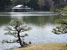 The pond has three islands, one of which is connected with a bridge. There are iso-watari — this term refers to the stepping stone pathways that lead across shallow parts of the pond. When crossing the pond using iso-watari, one can view the fish in the pond. It teems with carp, turtles, and waterfowls. Its location near the river and the bay attracts a large number of birds. There are over 4000 trees in this constricted space. Japanese Black pine (Pinus thunbergii) are the dominant trees. Purple azaleas, Hydrangea macrophylla, Iris ensata and Taiwan cherry (Prunus campanulata) provide seasonal color.