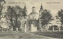Following the joint German-Soviet invasion of Poland, which started World War II in September 1939, Klimontów was occupied by Germany. From 1941 to 1944, the occupiers operated a forced labour camp in the settlement.[2] The Polish resistance movement was active in the town, and on March 4, 1943, the Jędrusie organization seized the German warehouses located in the abbey.[3] After the German atrocities and extermination of the Jewish population, the number of inhabitants fell to 2,200 by 1946.