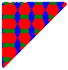 The KKM lemma states that there is a point covered by all three colors simultaneously; such a point is clearly visible in the picture.