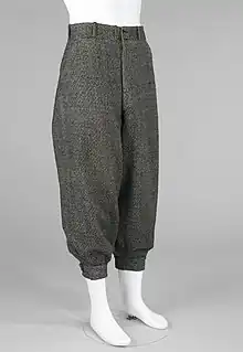 Knickerbockers (or knickers in the US) are a form of baggy-kneed breeches, particularly popular in the early 20th-century United States. Golfers' plus twos and plus fours are similar.
