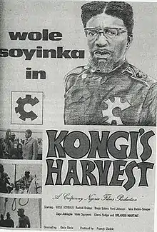 Kongi's Harvest is a 1970s Nigerian drama film directed by Ossie Davis. The film was adapted from a screenplay by Wole Soyinka adapted from his 1965 play of the same name.[1][2] Soyinka, a Nigerian playwright, poet, and the first African to be awarded the Nobel Prize in Literature in 1986, also starred in the leading role as the dictator of an African nation.[3][4]