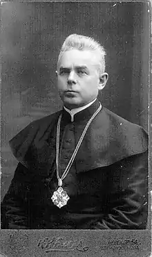 Olšauskas also joined the Lithuanian and Belarusian Constitutional Catholic Party, established by Bishop Eduard von der Ropp, and was this party's candidate to the first State Duma.[20] In advance of the Great Seimas of Vilnius, he also worked on the program for the Lithuanian Christian Democratic Party, but the party was established only 1917.[21] Olšauskas supported and was board member of the Society of Saint Zita for Lithuanian female servants[22] and Society of Saint Casimir for book publishing.[23] When newspaper Vilniaus žinios was discontinued due to financial difficulties, Olšauskas and others decided to establish new newspaper Viltis.[24] Olšauskas was elected to the council of a credit union established by Saliamonas Banaitis and lawyer Antanas Petraitis in October 1911.[25] Olšauskas also wanted to establish an organization advocating against Lithuanian emigration to United States, but plans were interrupted by World War I.[26] Due to his various activities, Russian police kept an eye on Olšauskas.[27] He was tried in January 1910 for the failure to comply with a circular of the Ministry of Internal Affairs that mandated a certain registration procedure for those wishing to convert from Eastern Orthodoxy to Catholicism.[28] Olšauskas was one of about 400 members of the clergy facing the same charges.[29] He defended himself and was acquitted.[30]