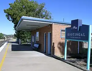 Kootingal railway station is located on the Main Northern line in New South Wales, Australia. It serves the town of Kootingal, opening on 9 January 1882 as Moonbi when the line was extended from West Tamworth. It was the terminus of the line until it was extended to Uralla on 2 August 1882. It was renamed Kootingal on 20 April 1914.[1] Opposite the station lies a passing loop.