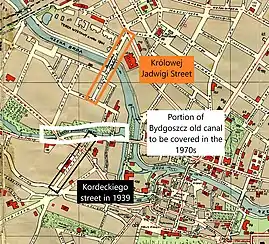 In 1974–1975, after the filling of a portion of Old Bydgoszcz Canal,[3] Kordeckiego street gained connection with Królowej Jadwigi Street at the crossing with Focha street in the north.