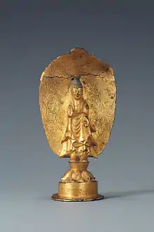 - Standing Bodhisattva with triple head ornament, probably Goguryeo, mid-6th century. Gilt bronze, h. 15 cm. National Museum of Korea, Treasure No. 333.