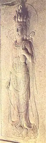Many extant Baekje sculpture survive in Japan today. Horyu-ji Treasure no. 151 (image) is accepted by virtually all Japanese authorities to be of Korean origin[24] and was brought to Japan in the middle 6th century.[25] The four rectangular cavities in the back of the statue is a trait far more common in Korean than Japanese sculpture.[26] The image was probably used as a private devotional icon brought by Korean settlers. Hōryū-ji Treasure no. 158 (image), a pensive image is another image generally considered by Japanese scholars to be from Korea and is dated on stylistic grounds to the mid-6th century.[27][28] The Funagatayamajinja Bodhisattva, probably once part of a triad, has a crown with three flowers which was common early Three Kingdoms sculpture but not extant in Asuka sculpture. The image is believed to have originated in Korea.[29]