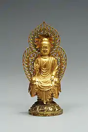 Images of the Buddha were probably first imported by monks sent from China and the Buddhist sculpture of Korea is indebted to prototypes developed in India, Central Asia, and China. From these influences, a distinctive Korean style formed.[2][3] Korean Buddhas typically exhibit Korean facial characteristics, were made with native casting and carving techniques, and employed only some of the motifs that were developed earlier in Buddhist art.[1] Additionally, Korean artisans fused together different styles from different regions with their own tastes to form a native art tradition.[4] Korean art is too often incorrectly described in Western literature as merely a passive bridge transmitting Chinese art to Japan. One area of Korean art where this is decidedly not the case is in Korean Buddhist sculpture. Korean stylistic developments and forms were greatly influential in the Asuka, Hakuhō, and Tenpyo periods of Japanese Buddhist sculpture when Korea transmitted Buddhism to Japan in the 6th century.[1][5][6]