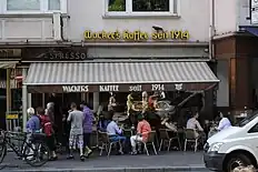 On the opposite side of the street, between Kleinem Hirschgraben and Weißadlergasse, stands a three-part structure that is not parallel to the parking garage but rather spans a trapezoidal area. Located at Kornmarkt 9 is the renowned coffee shop Wackers Kaffee, founded in 1914, which includes its own roastery and coffee house- a well-known establishment in the city.