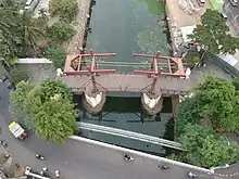 Kota Intan Bridge (Indonesian: Jembatan Kota Intan) is a hanging bridge located at Kali Besar of Kota Tua in Jakarta. It is the oldest bridge in Indonesia that was built in 1628 by the Dutch East India Company. Now the bridge is under the management of the Jakarta Provincial Tourism and Culture Department.[1] The bridge is also known as jembatan gantung or hanging bridge.[2] In the past, it operated as a Bascule bridge. The double “leaf” of the bridge would swing upward to provide clearance for marine traffic during the colonial era.