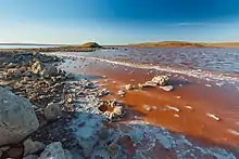 Koyashskoye (Russian: Кояшское озеро) or Koiaske (Ukrainian: Кояське озеро) is a salt lake on the coast of the Kerch Peninsula in Crimea, separated from the Black Sea by a strip of land. It is 4 kilometers long, 2 kilometers wide and a meter deep. The lake has the particularity to have a pink to scarlet color, depending on the light, due to the presence of microscopic algae living in the water. When the water evaporates, the salt in the lake crystallizes on the stones and the shores, producing crystal stones and the scent of viola. Uzunlarske Lake is located directly west.