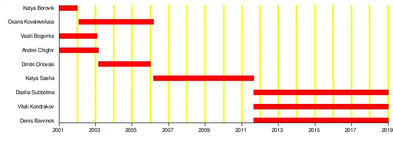 Past members | Ekaterina Borovik Oxana Kovalevskaya Vasily Bogomya Andrei Chighir Dmitry Orlovsky Katya Sasha |