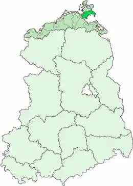 Kreis Putbus covered the southern part of the island of Rügen including the peninsulas of Mönchgut and Zudar. The following subdivisions belonged to the district: the towns of Garz and Putbus and the municipalities of Alt Reddevitz, Altefähr, Altensien, Binz, Dreschvitz, Gager, Groß Schoritz, Gustow, Göhren, Jarkvitz, Karnitz, Kasnevitz, Lancken, Middelhagen, Neu Reddevitz, Baabe, Poseritz, Rambin, Samtens, Seedorf, Sehlen, Sellin, Swantow, Thießow, Zirkow and Zudar.