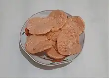 Krupuk (Javanese)[n 1] is a cracker made from starch or animal skin and other ingredients that serve as flavouring. Most krupuk are deep fried, while some others are grilled or hot sand fried. They are a popular snack in maritime Southeast Asia (Indonesia, Singapore, Malaysia, Brunei, and Philippines), and are most closely associated with the culinary traditions of Indonesia, in particular Javanese cuisine. It is an ubiquitous staple in its country of origin, and has spread to other countries either via the migration of diaspora populations or exports.[3]