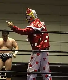 Akinori Tsukioka (月岡 明則, Tsukioka Akinori, born August 19, 1975) is a Japanese professional wrestler better known as Kuishinbo Kamen (くいしんぼう仮面, Kuishinbō Kamen), a masked clown character. Kuishinbo Kamen is Japanese for "Gluttonous Mask". For a while he was forced to give up the Kuishinbo Kamen character, instead he worked as "Super Robo K", a futuristic Robot character, but returned to the Kuishinbo Kamen identity later on.