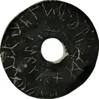 The second spindlewhorl was discovered by farmers plowing a field near Shokhtoy. As it was found by happen-stance outside of an orderly archaeological dig Ksenofontov didn't consider the Kurumchi as the probable creators of the item.[32] Donner and Räsänen were only able to distinguish some of the eroded characters. They offered "the fifth of the snowy month" and "the fifth month of the arqar year" as partial translations.[42] Later Ksenofontov,[46] Malov,[41] Orkun,[37] and Bazin[47] offered their own interpretations of the partial text. In 2019 Tishin made a comprehensive translation.[38]