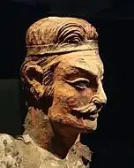 The art of Khalchayan at the end of the 2nd-1st century BCE is probably one of the first known manifestations of Kushan art.[14] It is ultimately derived from Hellenistic art and possibly from the art of the cities of Ai-Khanoum and Nysa.[14] At Khalchayan, rows of in-the-round terracotta statues showed Kushan princes in dignified attitudes, while some of the sculptural scenes are thought to depict the Kushans fighting against the Sakas.[15] The Yuezis are shown with a majestic demeanour, whereas the Sakas are typically represented with side-wiskers, displaying expressive and sometimes grotesque features.[15]