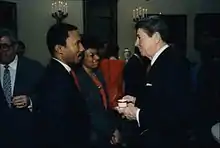 In February 1996, Mfume left the House to accept the presidency of the National Association for the Advancement of Colored People (NAACP), saying that he could do more to improve American civil rights there than in Congress.[8] He reformed the NAACP's finances to pay off its considerable debt while pursuing the cause of civil rights advancement for African Americans. Though many in Baltimore wanted Mfume to run for mayor in the 1999 election, he stayed with the NAACP.[9]