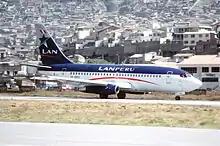 LATAM Airlines Perú (formerly LAN Perú S.A.) is an airline based in Lima, Peru.[1] It is a subsidiary of LATAM Airlines Group, which owns 49% of the airline. It operates scheduled domestic and international services. Its main hub is Jorge Chávez International Airport.[2] LATAM Perú is the dominant airline in Peru, controlling 73.4% of the domestic market.[3]