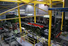 In July 2007, the museum pushed back the expected completion date by 18 months, due in part to issues with the boiler restoration.[75] By 2009, with further problems encountered including misaligned frames and a cracked cylinder, plus rising metal prices, the museum launched the SOS ("Save Our Scotsman") appeal, seeking to raise a further £250,000 with the aim of completing the work by the end of the year.[79] In May 2011, Flying Scotsman was unveiled on the museum's turntable, finished in wartime black LNER livery; after final tests, it was to be painted LNER Apple Green and have it running excursions by the summer.[80] However, cracks were discovered in the horn blocks and further testing revealed more cracks throughout the frame assembly, leading to the replacement of the main stretcher bar, horn ties and middle cylinder motion bracket, all of which were deemed beyond repair.[75]