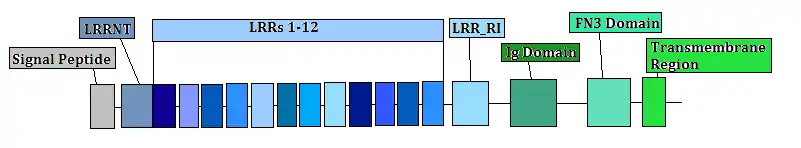 The LRRN3 protein contains 12 leucine-rich repeats, along with an LRRNT and an LRR_RI domain. Leucine-rich repeats are unusually rich in the hydrophobic amino acid leucine. They are common in protein-protein interaction motifs and are typically 20-29 amino acids in length. All major classes of LRRs are known to have a curved horseshoe structure with a parallel beta sheet on the concave side and mostly helical elements on the convex side. The LRRN3 protein also has an immunoglobulin domain, a fibronectin type III domain, and a transmembrane region toward the end of the protein.[10] The composition of this protein is shown below.