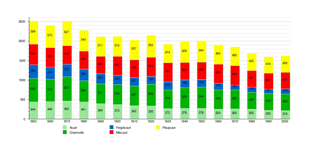Asuel is first mentioned in 1136 as Asuel.[4] Charmoille is first mentioned in 1136 as Calmillis.[5] Fregiécourt is first mentioned in 1136 as Frigiscurth.[6] Miécourt is first mentioned in 866 as Curtem que Mietiam.[7] Pleujouse is first mentioned in 1105 as de Pluiusa.[8]