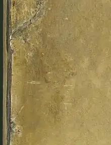There are signs of restoration with thin paint applied with a brush. Three stitch holes in the left-hand margin of the vellum, indicate that the leaf was once in a bound volume.[7]