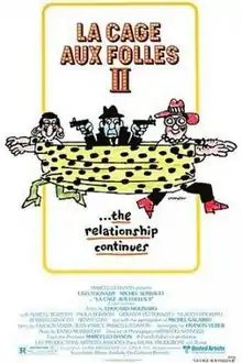 La Cage aux Folles II is a 1980 French comedy film and the sequel to 1978's La Cage aux Folles. It is directed by Édouard Molinaro and stars Michel Serrault as Albin (stage name ZaZa), the female impersonator star of a gay night-club revue, and Ugo Tognazzi as Renato, his partner of over 20 years.