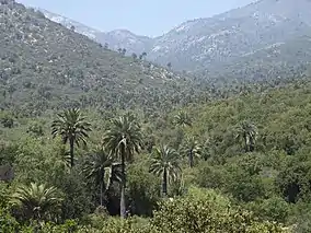 La Campana National Park is located in the Cordillera de la Costa, Quillota Province, in the Valparaíso Region of Chile. La Campana National Park and the Vizcachas Mountains lie northwest of Santiago.[2] This national park covers approximately 80 square kilometres (31 sq mi) and is home to one of the last palm forests of Jubaea chilensis (Chilean Wine Palm), which prehistorically had a much wider distribution than at present.[3] Another attraction is the Cerro La Campana, which lends its name to the park. In 1834 Charles Darwin climbed this mountain, during the second voyage of HMS Beagle.