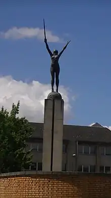 The statue was created by Guillaume in 1914, originally called La Victoire. It depicts a naked female figure standing on tip-toe with both feet on a bronze hemisphere. She lifts her face to the sky and holds both arms aloft, with a sword in her right hand.