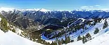 Coma Pedrosa in the north-west of the parish is the highest point in the Principality of Andorra at 2,942 metres (9,652 ft), and has panoramic views of the Pyrenees. The mountain is also the site of the Coma Pedrosa Nature Reserve.[3] It is covered by heavy snowfalls in winter, and usually retains some snow cover in summer. The four next-highest peaks are Medacorba (2914 m), Sanfonts (2888 m), Pla de l'Estany (2859 m), and Racofred (2837 m).[4] The town of La Massana has an average elevation of 1,240 metres (4,070 ft) above sea-level. There are four lakes: Forcats, Montmantell, Estany Negre, and Les Truites Lake.[3]