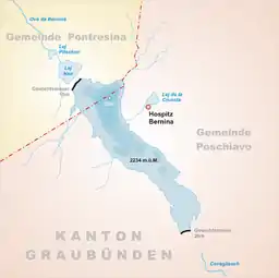 It has an elevation of 2,234 m (7,329 ft), a length of 2.85 km (1.77 mi), a surface area of 1.50 km2 (0.58 sq mi) and a maximum depth of 53 m (174 ft). Once the site of two smaller lakes (Lago Bianco and Lago della Scala), the current reservoir was formed by the constructions of two dams (Scala and Arlas) at its southern and northern ends. The current lake drains to the south, as did both its precursor lakes, with its water eventually reaching the Mediterranean via the rivers Poschiavino, Adda and Po. By contrast, Lej Nair, just below the northern dam. drains north into the Black Sea via the rivers Inn and Danube.[1][2]