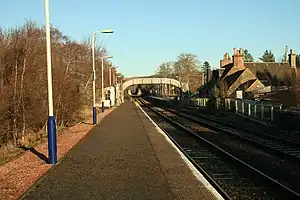 Both platforms have waiting areas and benches, whilst there are also bike racks and a help point adjacent to platform 2. Platform 2 has step-free access from the car park, whilst platform 1 can only be accessed from the footbridge.[8] As there are no facilities to purchase tickets, passengers must buy one in advance, or from the guard on the train.