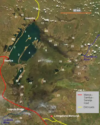 There are numerous lagoons in the swamps, the more prominent ones are: Lake Chali (12) in the south-west, Lake Chaya (13) in the east at the mouth of the Lulingilla River in the east, Lake Wumba (14) in the north-east at the confluence of the Chambeshi and Luansenshi (20) Rivers, and the Pook Lagoon (15) in the East near Nsalushi Island (25).[7]