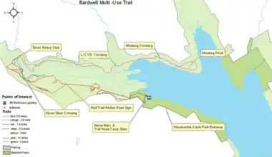 The Bardwell Equestrian and Multiuse trail is over 13 miles; visitors can hike, bike, or ride horses on it. The trail provides a round trip of about 26 miles. Trail etiquette gives equestrians the right of way.[24] The lake offers a flat main trail, with numerous loops into surrounding meadows, croplands, and bottomland hardwood forest along Waxahachie Creek. The trail is within the designated hunting area surrounding the lake.[25][26]