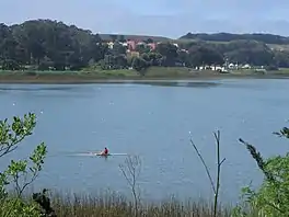 Lake Merced (Spanish: Laguna de Merced) is a freshwater lake in the southwest corner of San Francisco, in the U.S. state of California. It is surrounded by three golf courses (the private Olympic Club and San Francisco Golf Club, and the public TPC Harding Park), as well as residential areas, Lowell High School, San Francisco State University, Lakeshore Alternative Elementary School, Stonestown Galleria, Fort Funston and the Pacific Ocean. The San Francisco Police Department shooting range, as well as a now closed skeet shooting club and the city's National Guard armory are also in the area. The lake was also the home of the Lake Merced Sailing Club, now closed, which provided training and racing for local sailors. Currently there is a paddling program operated by San Francisco State University .[1] The lake is home of the Pacific Rowing Club and St. Ignatius College Prep Rowing Team, both competitive rowing programs for San Francisco high school students.