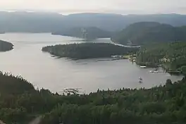 Flow between the dam and spillway was cut off for five days, then resumed at a reduced rate of 3 cubic metres per second (110 cu ft/s) in this section. Observations in the summer of 2005 showed there had been no significant impact on fish densities in the reduced flow area.[7] In the new part of the lake there is a deficit of oxygen at deeper levels and there is higher phosphorus content at al levels. These phenomena are due to decomposition of vegetation that had not been cleared before flooding, and were not expected to last more than a few years. Measures in the summer of 2005 showed that fish were quickly populating the new part of the lake.[8] Fish samples were made in 2005, 2007 and 2009, with notes of the length, weight, possible abnormalities and parasites, particularly brook trout. The results showed that the numbers and size of the fish in the river and the reservoir had not been affected, and if anything the fish were larger.[9]