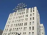 The district has an outstanding concentration of club buildings, historic luxury apartments, and a significant cluster of Deco structures,[6] including the terra cotta Charles Jurgens Co. building, the Elks Hall on Alice Street (now the Malonga Casquelord Arts Center), the Hill Castle Apartments on Jackson Street, The Hotel Harrison on Harrison Street, the Scottish Rite Center at the lake's edge on Lakeside Drive, the Alameda County Courthouse in the neighboring Civic Center district, which also features the Civic Center Post Office on 13th Street. The "Ideal Cleaners" shop features a neon sign and period appointments in the Art Deco style. Many of these historic buildings are protected as official city landmarks.[7][8] During a city Cultural Heritage Survey in the 1980s most of the district was designated as featuring historically significant architectural resources. The Survey was conducted by the city of Oakland's Planning Department and its Landmarks Preservation Advisory Board from 1980 to 1985.[1] Other historic places include the Victorian Camron-Stanford house on the shore of Lake Merritt at 14th Street and Lakeside Drive, the Municipal Boathouse on Lakeside Drive, the Greek revival Scottish Rite Center on Lakeside Drive, the eleven story Bechtel Building at 244 Lakeside, the Alician apartments on Alice Street with its ornate marble entrance, the Regillus condominiums on 19th street, the mission revival Scottish Rite Temple on Madison Street, and the historic Schilling Gardens on 19th Street.