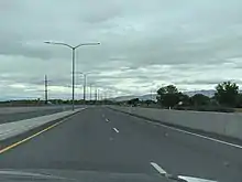 Original construction of parkway only had it running west from the intersection of Mike Jense Parkway and South 3110 West to the I‑15/US‑189 interchange. As construction began, (with groundbreaking on May 8, 2014) only the section of the current parkway north of West Center Street was referred to as Lakeview Parkway.[lower-alpha 1] The section south of West Center Street and west of I‑15 was referred to as the West Side Connector.[7] However, by the time the initial section of what had been referred to as the West Side Connector was opened for traffic on October 13, 2016,[8] it was also signed as Lakeview Parkway.[9] (The east end of the current parkway, east of I‑15 [formerly East 1860 South], had been constructed with 4-5 lanes about 20 years prior and was not considered part of the project.) While this initial section was graded for four lanes, only the two eastbound were paved from South 3110 West to just west of the intersection with South 500 West. East of that point, the parkway was a 4-lane divided highway through the I‑15/US‑189 interchange. Several years after initial construction, a traffic signal was installed at the intersection with South 500 West. In preparation for the construction of the new campus of Provo High School the section between West 620 North and West 1280 North was graded and the northbound two lanes were paved.