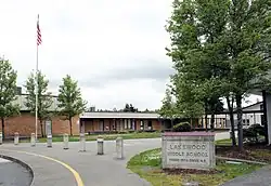 Lakewood School District 306 was formed in 1914 by consolidating three smaller school districts formed between 1891 and 1909. School District 45, the oldest and largest district in the area, was formed on February 28, 1891 and served 40 students at English. School District 65 was formed on November 12, 1892 and served 30 students in the Lake Goodwin area. School District 102, the newest and smallest district in the area, was formed on September 25, 1909 and served 20 students in Smokey Point.[2] The new district served 70 students from grades one to eleven in a three-story schoolhouse and sent its high school students to the nearby Arlington School District beginning in 1958. The schoolhouse was demolished in 1958 and students were moved to a new campus consisting of two wings and eight classrooms, later expanded to include a gymnasium and eleven classrooms by 1966. The campus was renovated into Lakewood Elementary School while older students were moved to an adjacent junior high school, now Lakewood Middle School, in 1972. The school district built its first high school, now Lakewood High School in 1983 and graduated its first senior class the following year.[3][4] The school district re-organized its schools in 1988, converting Lakewood Elementary into Lakewood Primary School, serving grades K–3, and converting the junior high school into Lakewood Intermediate School, serving grades 4–6. A bond issue was passed in 1992 to fund the construction of English Crossing Elementary School, opened in 1995 serving grades 3–5.[5] The primary school was renamed back to Lakewood Elementary and served grades K–2, while the intermediate school was converted back to Lakewood Middle School after an extensive remodeling, serving grades 6–8.[6][7] Cougar Creek Elementary School was completed in 2003 to supplement the two other elementary schools by serving grades K–5.[8][9] All three elementary schools were re-organized in 2011 to serve grades K–5 in all three schools, with Lakewood Elementary retaining its preschool program.[10]