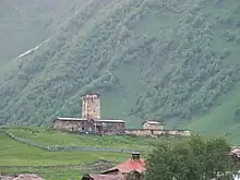 The Ushguli Church of the Mother of God,[lower-alpha 1] popularly known as the Lamaria Church,[lower-alpha 2] is a medieval Georgian Orthodox church in the community of Ushguli in Upper Svaneti. It is a simple hall church, with a projecting apse and an ambulatory. The interior contains two layers of medieval frescoes, in a state of deterioration. The church is inscribed on the list of the Immovable Cultural Monuments of National Significance of Georgia.[1]