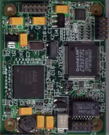 The Computer Subsystem (CSS) provided the processing power and storage capacity for the system. The CSS is based around an ARM core processor. Prior to the project's cancellation (when project funds were moved to Hurricane Katrina relief) the computer used was Techsol's Ethernet Audio Interface board,[9] powered by an s3c2410a processor from Samsung Semiconductor, featuring an ARM-920T core running at up to 200 MHz. The board included a low-power Ethernet interface using the cs8900a from Cirrus Logic, an audio interface using the internal IIS audio interface of the Samsung chip connected to an AKM integrated Audio Codec and Amplifier, a GPS receiver from Motorola, and using GPIOs for the push-buttons used for Volume UP/DOWN, and also Channel UP/DOWN. With a wide-voltage-range input power-supply, the entire wearable computer board was 2/3 the size of a business card (see photo).