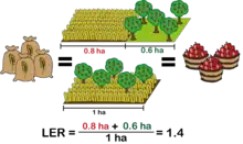 The land equivalent ratio can be used whenever more than one type of yield can be obtained from the same area. This can be intercropping of annual crops (e.g. sorghum and pigeonpea)[1] or combination of annual and perennial crops e.g. in agroforestry systems (e.g. jackfruit and eggplant).[3]