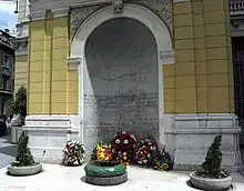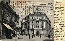 In 1896, the bank moved into the building of the Grand Hotel, which had recently closed after only one year of operations. The building had been erected in 1893-1895 on a design by architects Karel Pařík and Josip Vancaš.[10] It occupies a prominent location at the eastern end of Sarajevo's main thoroughfare, named Marshal Tito street since 1945.