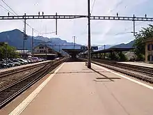 Landquart railway station (German: Bahnhof Landquart) is a major railway station in the municipality of Landquart, in the Swiss canton of Grisons. It is an intermediate stop on the Swiss Federal Railways Chur–Rorschach line and the junction of the Landquart–Davos Platz and Landquart–Thusis lines of the Rhaetian Railway.[1] It is served by long-distance, local, and regional trains.